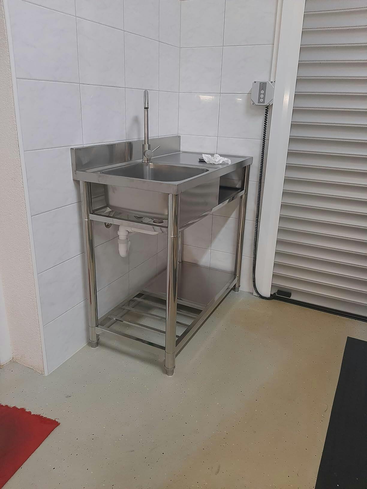 Garvee Edelstahl-Spülbecken Freistehend (119×45×81 cm) – Großes Doppelbecken mit Armatur, Arbeitsfläche & Stauraum, für professionelle Küchen & Gewerbe
