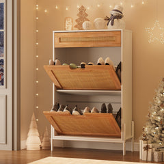 Garvee Natürlicher Rattan Schuhschrank Mit 2 Klapptüren, Schublade, Verstellbare Einlegeböden, Weiß Und Eiche Für Flur Und Eingang