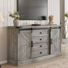 Garvee TV-Ständer Für Schlafzimmer Mit Schiebetüren, 4 Schubladen, Holz, Bargriffe, Für 65 Zoll TV, Bauernhaus-Stil, Weiß