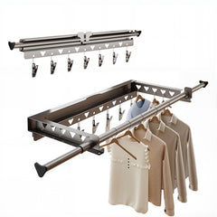 - 【Tragfähigkeit bis 30 kg】: Der wandmontierte Kleiderständer besteht aus Edelstahlrohr und einer stabilen H-förmigen Struktur, wodurch eine gute Tragfähigkeit und Stabilität gewährleistet wird. Gleichzeitig ist er mit 7 Unterwäsche- und Sockenclips ausgestattet. Die lange Stange eignet sich zum Trocknen von Steppdecken, Decken usw. und erfüllt so Ihren täglichen Trocknungsbedarf.